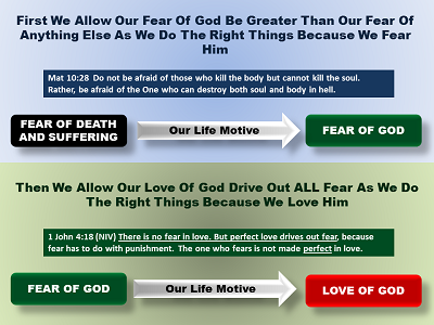 1 John 4:18 (NIV) There is no fear in love. But perfect love drives out fear, because fear has to do with punishment. The one who fears is not made perfect in love. We aren’t afraid of losing our salvation. We aren’t inflicted with tormenting fear that causes us to cringe before God. This is a bad type of fear which has to do with being afraid that we are going to receive punishment from God. Let’s think of a time when we were tempted to lie because of the surrounding social pressure. It isn’t a tormenting fear. It is a feeling of discomfort that is pressuring us to make a certain decision. Our awe of God should pressure us in a greater way than all of these other influences. |